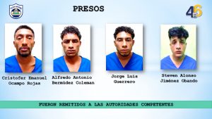 La Policía Nacional capturó en el barrio Milagro de Dios a los delincuentes: Cristofer Emanuel Ocampo Rojas, Alfredo Antonio Bermúdez Coleman, Jorge Luis Guerrero y Steven Alonso Jiménez Obando, quienes se desplazaban en motocicletas para cometer asalto en establecimientos comerciales, intimidando con arma de fuego a los guardas de seguridad, clientes y trabajadores, a los cuales les sustrajeron dinero y teléfonos celulares.