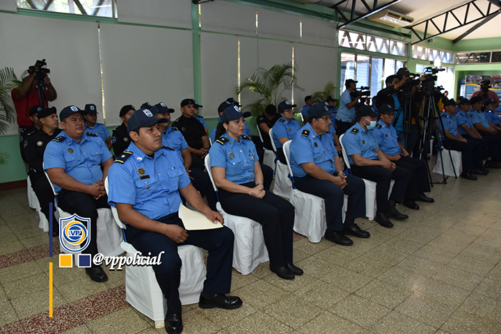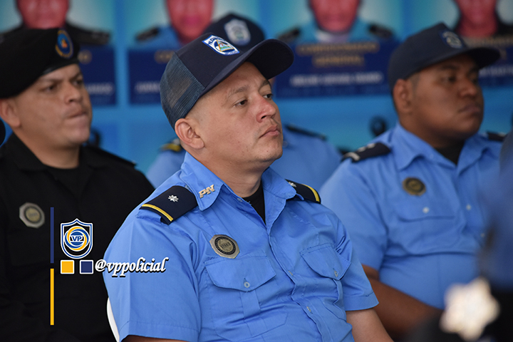 El acto fue presidido por el Comisionado General Enrique Salazar, Jefe de la División de Personal y Cuadros, acompañado del Comisionado César Alberto Leiva, Rector de la Universidad de Ciencias Policiales Leonel Rugama ¡Que se rinda tu madre! El compañero Alexander Serrano, Responsable de Innovación y Tecnología del INATEC y la Compañera Ana Eugenia González, Responsable de Formación Virtual del INATEC.