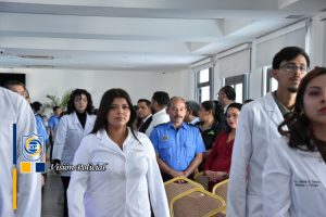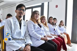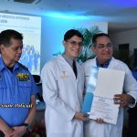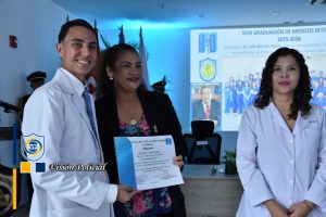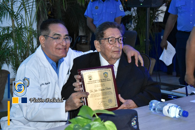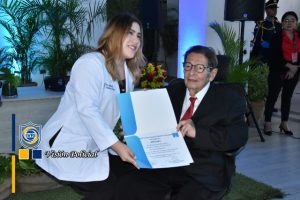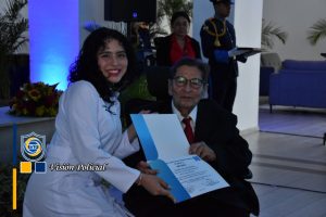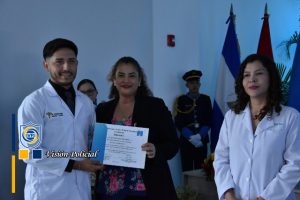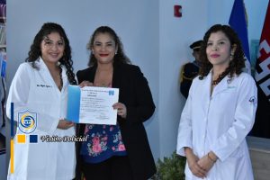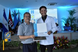 Su ejemplo vivo es inspiración para estos héroes de bata blanca que se comprometen a velar por la salud y vida de las familias nicaragüenses, en nombre de la Universidad, el Doctor Julio César Paladino le hizo entrega de una placa de reconocimiento.