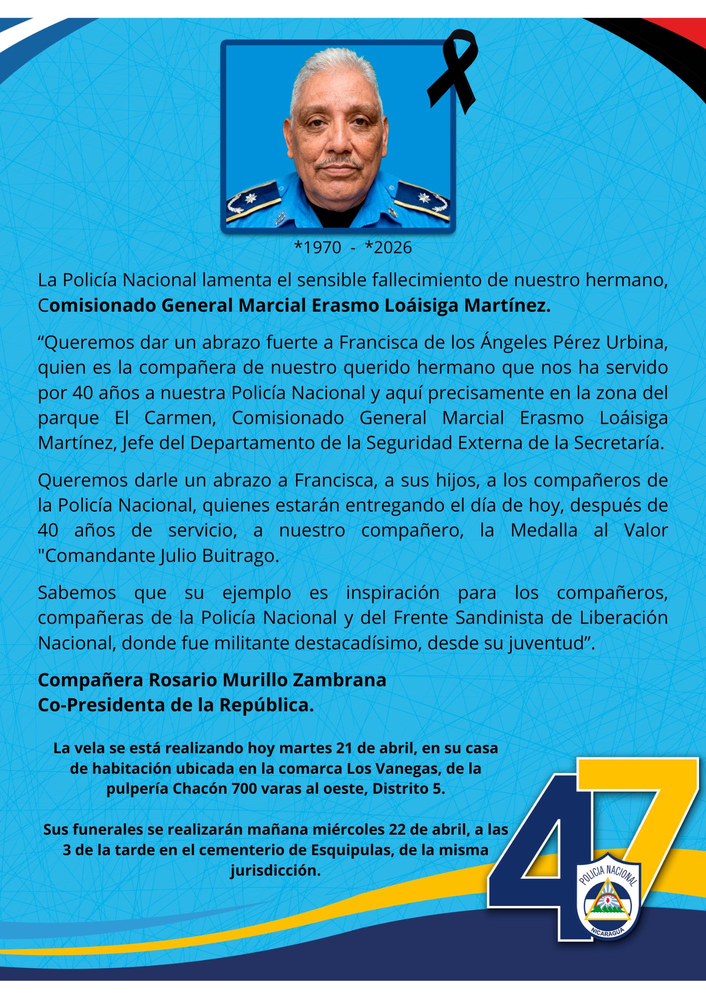Condolencias por el fallecimiento del Comisionado General Marcial Erasmo Loáisiga Martínez
