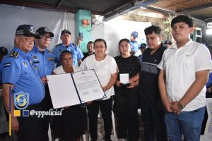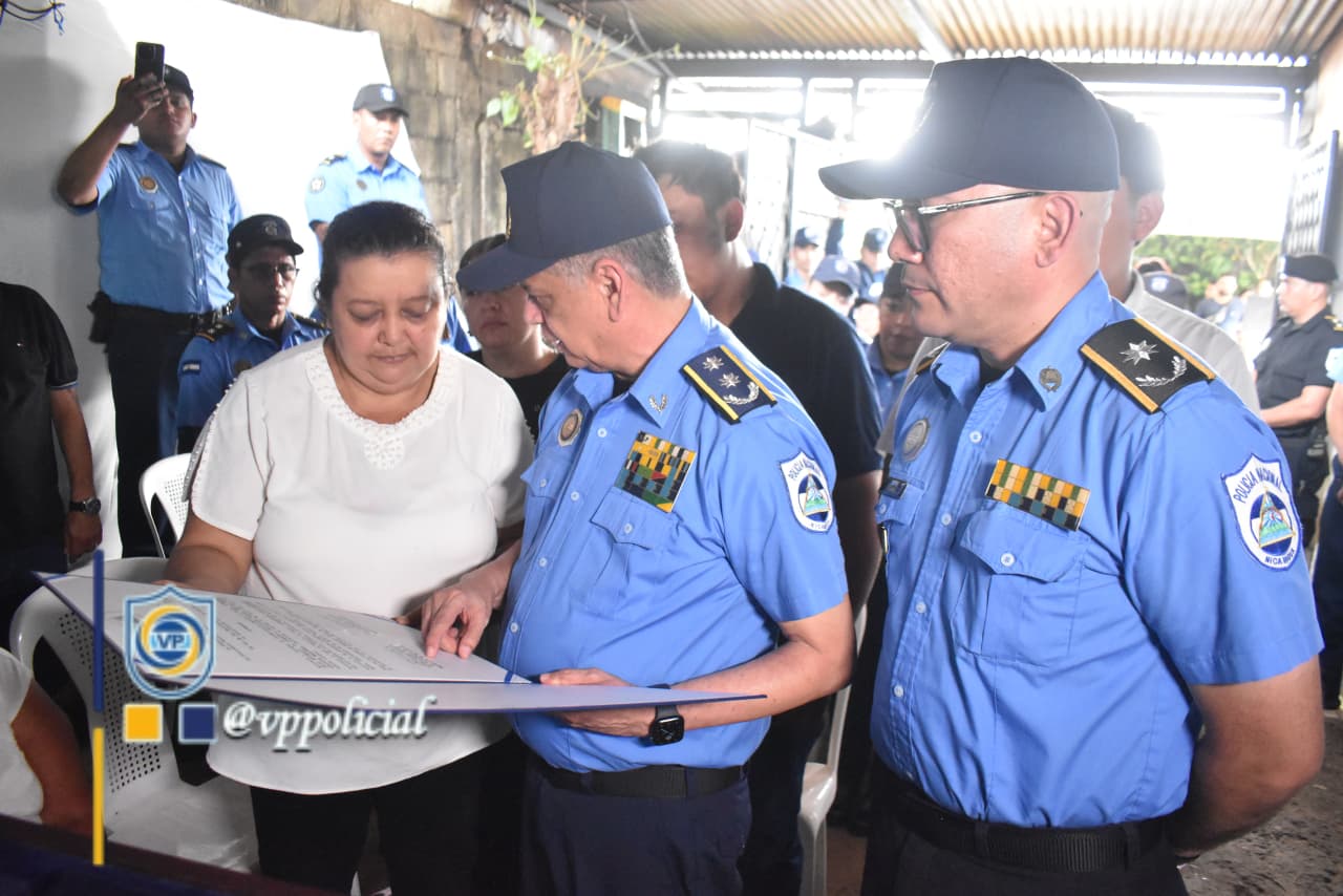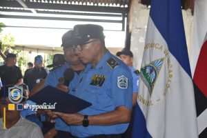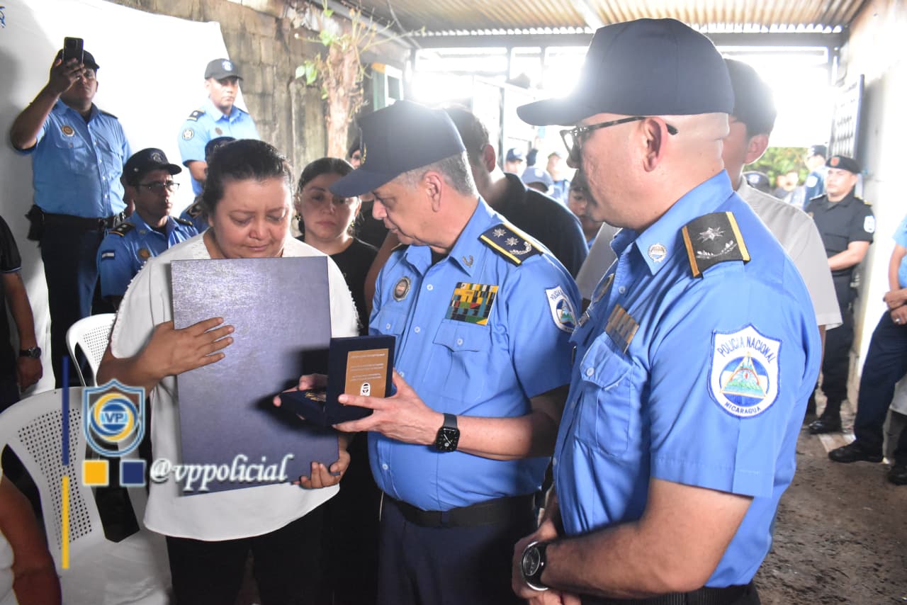 Seguidamente, el Primer Comisionado General Francisco Díaz Madriz y el Comisionado General Victoriano Ruiz Urbina, Jefes de las Fuerzas Policiales de Nicaragua entregaron la condecoración para su custodia a la señora Francisca de los Ángeles Pérez Urbina, viuda del Comisionado General.